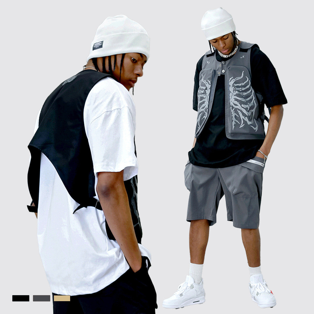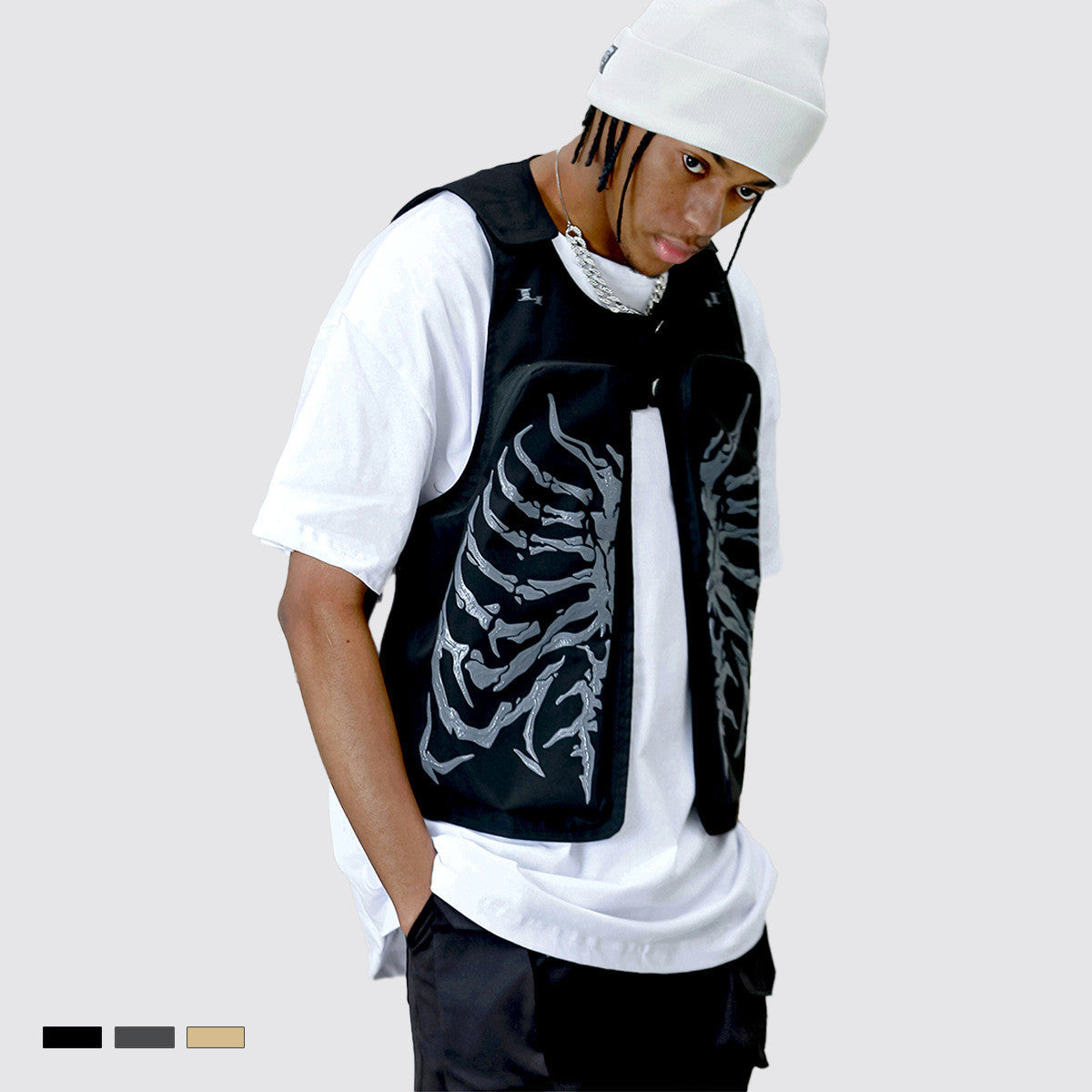 Crafted with a premium fabric, the vest features an intricate, grey skeletal print that captures a daring aesthetic. The print is meticulously designed to mimic the contours of the human rib cage, making it not only a garment but a piece of wearable art.